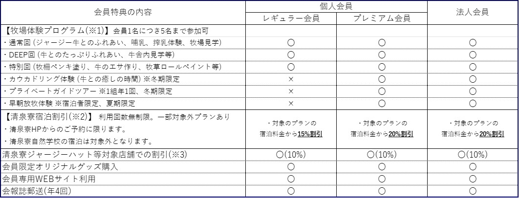 清泉寮宿泊割引の割引率と、プレミアム会員限定の特別プログラム(年1回のプライベートガイド、カウカドリング体験、早朝放牧見学)が異なります。