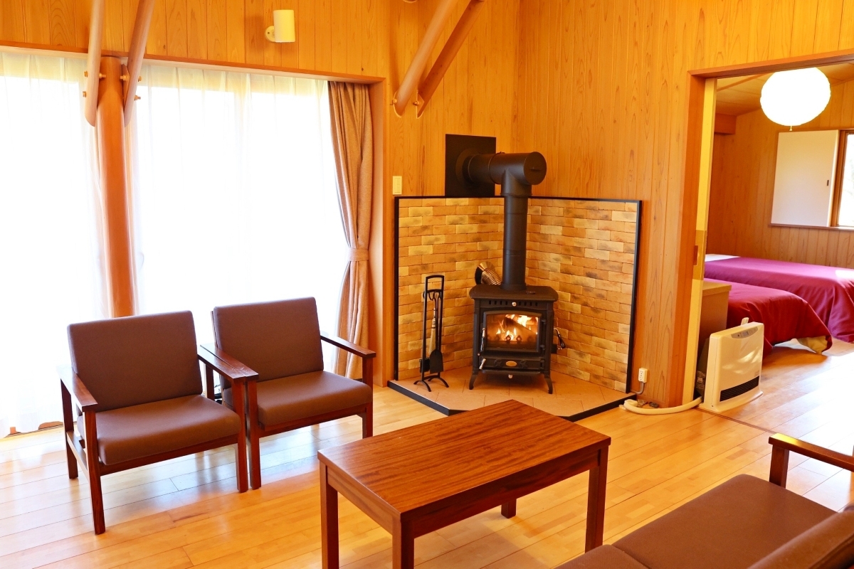 本館から少し離れた静かな森の中に佇み、キッチン、バス、トイレを完備。ファミリーやグループ旅行の利用者に人気な一戸建ての貸別荘タイプのお部屋です。リビングには暖炉や薪ストーブを備えたタイプもございます。あたたかな炎を眺めながら、ゆったりとした時間をお楽しみください。